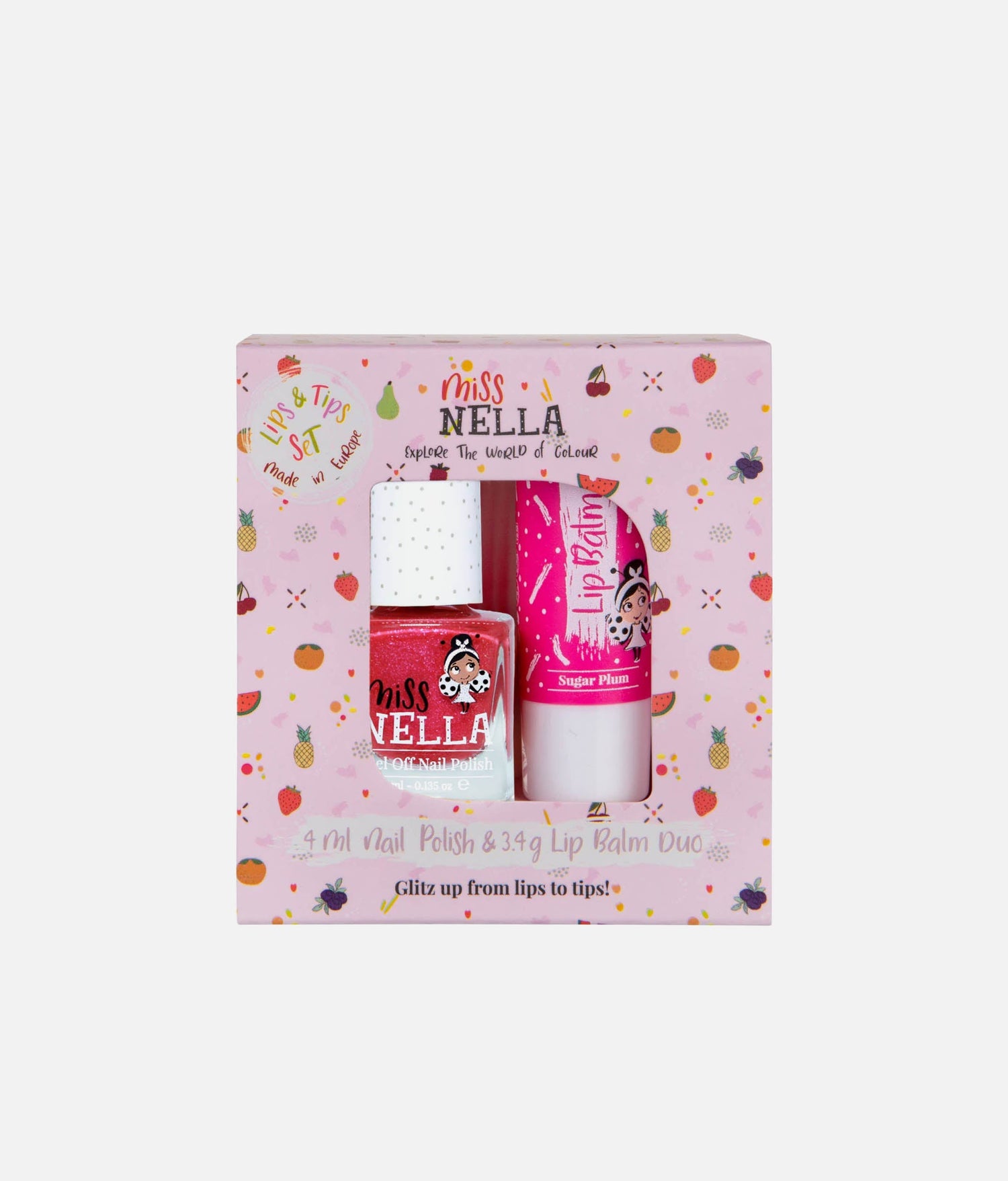 Calling all tiny dancers and glitter queens! The Miss Nella Duo Set is here to add that extra sparkle to your everyday routine, whether you're heading to dance class, dressing up with friends, or putting on your own show at home. With a peel-off pink nail polish and a super-smooth Sugar Plum lip balm, this cute combo is your new go-to for glamming up in a flash (no grown-up help needed!).
