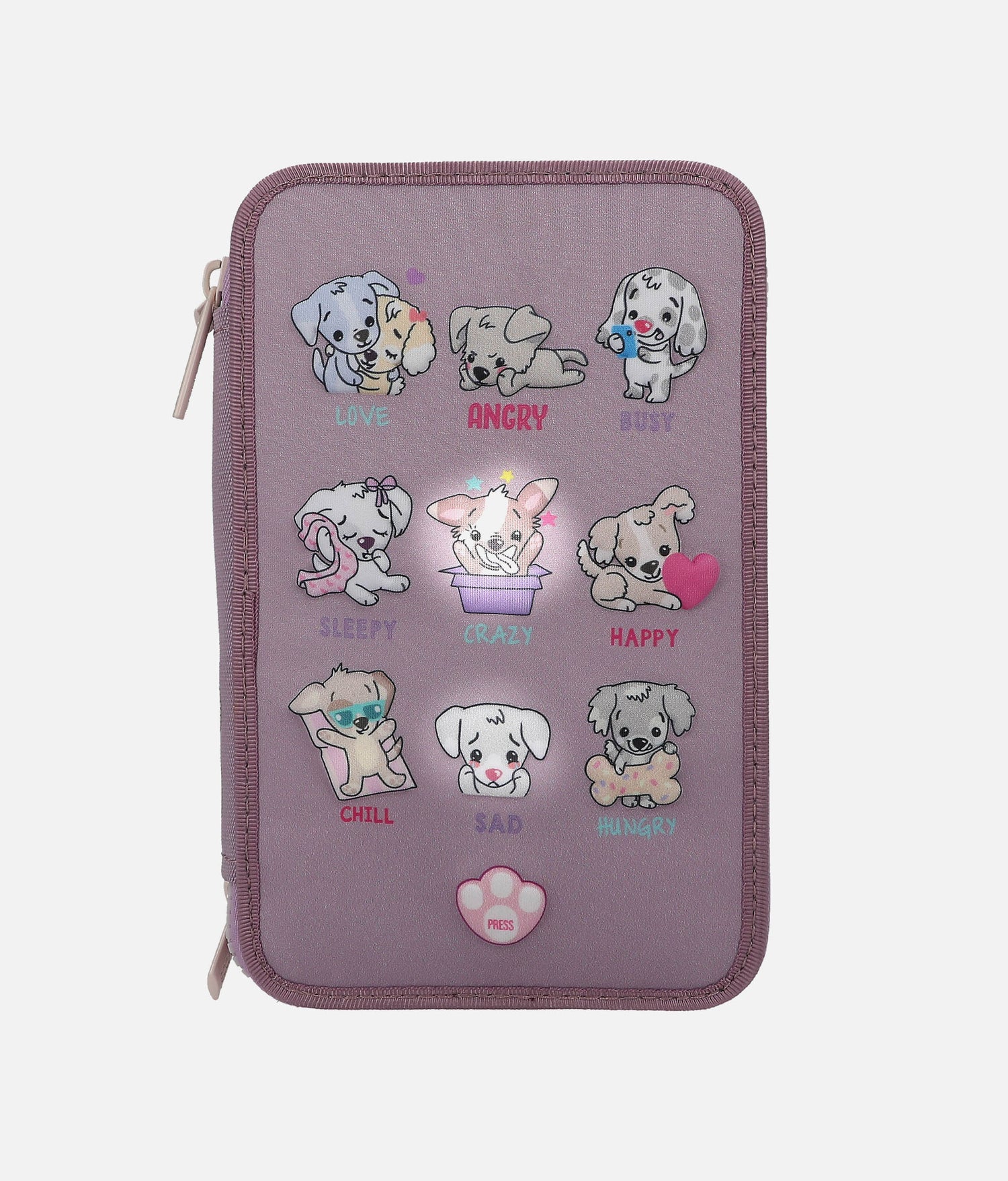 Exciting LED Light Show Feeling tired, happy, or relaxed? Let the mood-enhancing LED feature of this pencil case lift your spirits! Press the button and watch as the light dances from one cute dog to another, finally stopping on a random pup after approximately 7 seconds. It's a delightful surprise every time, sure to bring a smile to any young girl's face.