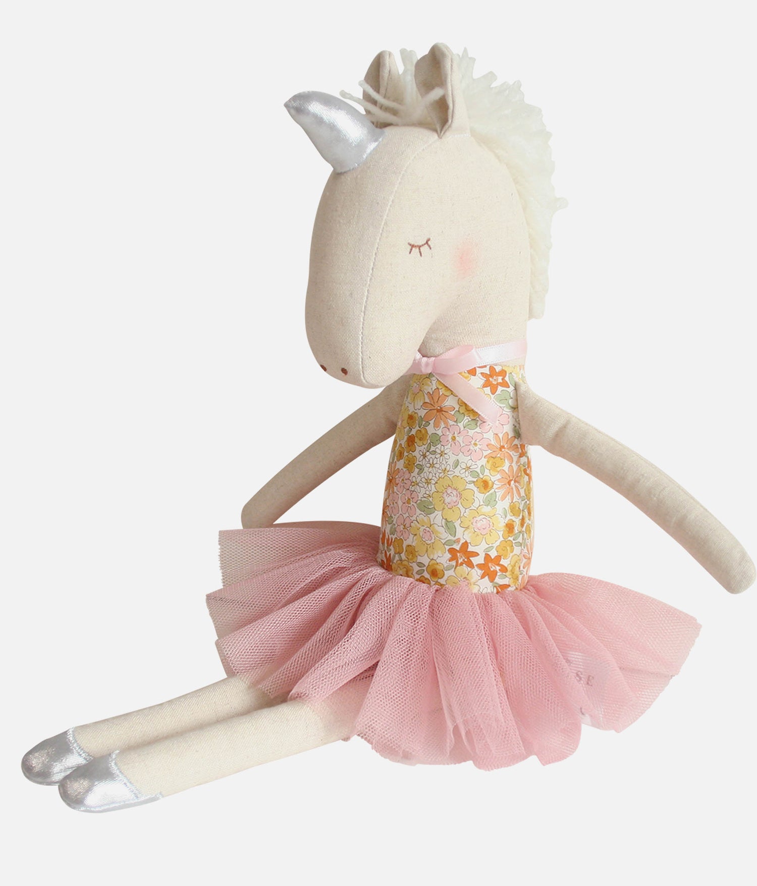 Calling all tiny ballerinas! Get ready to dance into a world of magic and fun with the Yvette Unicorn Doll from the Alimrose Soft Dolls Collection. Standing at 43cm tall, Yvette is dressed to impress with her dreamy blush tulle tutu and Sweet Marigold print. She even has a sparkling unicorn horn and matching shoes that add a touch of magic to every pirouette!